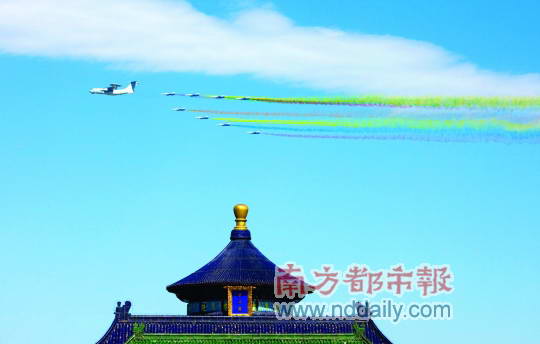 接受检阅的多机编队的领队梯队从天坛祈年殿上空飞过。新华社发