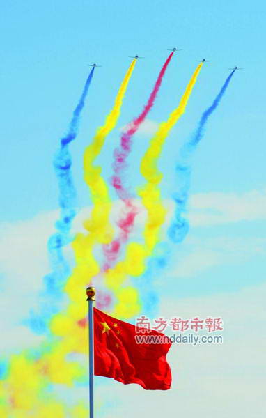 教练机梯队在空中拉出道道彩色烟带,为气势磅礴的国庆60周年阅兵画上圆满句号。 新华社发