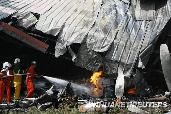 10月17日,在菲律宾首都马尼拉南部的拉斯皮尼亚斯,消防人员在扑灭坠毁后燃烧的DC-3飞机残骸。