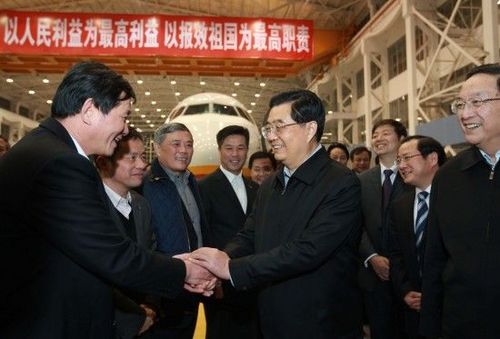 胡锦涛在承担大型客机总装任务的中国商飞上海飞机制造有限公司考察时,勉励企业员工发扬科学求实精神,让中国人自主研制的大型客机早日飞上蓝天。 东海之滨,黄浦江畔,我国最大的经济中心城市上海,积极应对国际金融危机冲击,到处迸发出新的活力。 1月14日至17日,中共中央总书记、国家主席、中央军委主席胡锦涛来到上海市考察工作。在中共中央政治局委员、上海市委书记俞正声等陪同下,总书记深入科研基地、产业园区、企业车间,就转变经济发展方式、推动经济社会又好又快发展进行调查研究。 考察期间,胡锦涛着重了解了上海推动科技自主创新、振兴装备制造业和发展现代服务业的情况。 研制和发展大型客机,寄托着几代中国人的夙愿。中国商用飞机有限责任公司是实施大型客机项目的主体,也是统筹干线飞机和支线飞机发展、实现我国民用飞机产业化的主体。胡锦涛怀着浓厚兴趣,来到中国商飞所属的上海飞机制造有限公司考察。总书记走进公司综合试验室,看设备、听介绍、问进展,为科研人员鼓劲加油。在新支线飞机总装车间,总书记登上一架样机,走进舱内察看仪器设备,了解飞机性能和技术水平。 装备制造业是我国的重要基础性、战略性产业,也是上海的支柱产业。胡锦涛来到上海电气临港重装备制造基地考察。 经过4年多建设,临港基地已初步建成近3万平方米的重型加工装配车间以及铁路、码头等配套设施,集聚了一批重装备制造企业。胡锦涛详细了解基地规划和建设情况,希望基地充分发挥产业、技术、人才集聚优势,努力打造世界一流的现代装备制造基地。 在承接国家重大核电工程设备的上海电气核电设备有限公司,胡锦涛同企业干部职工深入交谈,勉励大家以推动电力设备国产化为己任,努力抢占世界电力设备制造高地。 在上海电气船用曲轴有限公司,胡锦涛走进机器轰鸣的车间考察。总书记鼓励他们生产出更多具有国际一流水平的产品,推动我国由“造船大国”向“造船强国”迈进。 由中国科学院和上海市政府共同建设的上海同步辐射光源工程,对我国建设国家知识创新体系、提升科技综合实力具有重大意义。在光源工程的科学装置现场,胡锦涛专注地察看关键设备,详细了解这套装置的物理原理、设备性能和应用领域。得知科技人员和工程建设者仅用52个月就又好又快完成了这一重大工程时。 总部设在上海的中国银联股份有限公司是一家股份制金融服务企业。胡锦涛十分关心银联卡运行情况,专门前往这家公司考察。当听说银联卡国内持有量已突破21亿张、并在境外83个国家和地区实现受理,总书记十分高兴。胡锦涛走到一台自助终端机前,拿起一张银联卡亲自操作,体验自助刷卡交费的快捷和便利。总书记说,银行卡产业是大有希望的产业,希望你们不断扩大业务领域,提高服务水平,加快国际化进程,努力把“银联”打造成国际主要银行卡品牌。 上海外高桥保税物流园区是全国首个“区港联动”试点区域。胡锦涛来到这个物流园区,听取园区建设情况介绍,了解园区推进贸易便利化、构建国际贸易服务平台的情况。胡锦涛强调,要进一步创新体制机制,不断完善服务措施,把物流园区建设得更好,为促进上海经济发展方式转变和产业结构优化升级发挥更大作用。 位于卢湾区繁华地段的原上海汽车制动器公司一片闲置厂房,经过6年多的开发,建成了闻名上海的“8号桥”创意园区。走在园区里,一件件造型时尚的生活用品,一幅幅灵感四溢的艺术创作,一个个风格新锐的设计方案,吸引了胡锦涛的目光。胡锦涛饶有兴致地走进一家英国设计公司,了解这家公司的业务发展情况。总书记说:创意产业蕴藏着巨大发展潜力。要进一步做好园区规划,不断完善服务体系,努力营造创新氛围,真正把创意产业打造成上海经济发展的新亮点。 展讯通信(上海)有限公司是一家由归国留学人员创办的高技术企业。在这家企业的产品展示厅、实验室,胡锦涛着重了解企业自主研发3G手机芯片等情况,并拿起手机,试用收看电视和视频通话功能。在企业研发工作区,总书记看到研发团队的骨干都是年轻人,感到十分高兴。 考察结束时,胡锦涛听取了上海市委和市政府的工作汇报,对上海近年来的工作给予充分肯定。胡锦涛指出,今年是实施“十一五”规划的最后一年,也是筹办举办上海世博会的决战之年。他希望上海广大干部群众高举中国特色社会主义伟大旗帜,以邓小平理论和“三个代表”重要思想为指导,深入贯彻落实科学发展观,进一步增强责任感和使命感,解放思想、凝聚力量、奋力拼搏、开拓创新,努力把上海世博会办成成功、精彩、难忘的盛会,努力开创上海改革开放和社会主义现代化建设新局面,当好推动科学发展、促进社会和谐的排头兵。 胡锦涛强调,要把加快经济发展方式转变作为深入贯彻落实科学发展观的重要目标和战略举措,进一步推进产业结构优化升级,进一步增强自主创新能力,进一步推进节能减排和环境保护,进一步深化改革开放,在转变经济发展方式上取得突破性进展。要努力做好解民忧、惠民生各项工作,加强和改进社会管理,使经济发展成果、经济发展方式转变成效更好惠及广大人民群众。要把贯彻落实党的十七届四中全会精神的过程变成坚持党要管党、从严治党,以改革创新精神抓党建、不断提高党