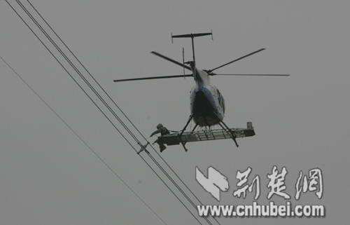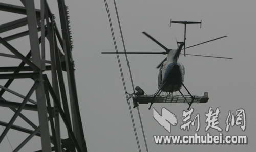 武汉直升机在超高压线上带电作业 上下翻飞
