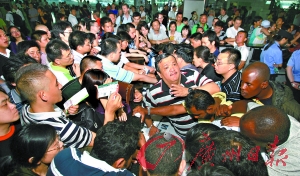 白云机场万人滞留 旅客激动砸毁柜台 从前天下午至昨日凌晨3时,白云机场共有277个航班发生延误,滞留机场的旅客一度超过万人。由于受到雷暴影响,机场出港航班从凌晨4时左右才得以陆续恢复,但因外地备降航班返港等原因,昨日机场航班秩序仍没有完全恢复正常。南航表示,正调配大型飞机紧急疏运旅客,如果没有恶劣天气,今日航班将恢复正常。 机场出现大面积延误 5月7日下午3时,白云机场召开紧急新闻发布会称,5月6日~7日,华南地区沿海产生雷暴天气,这一数年未见的强对流云系及强雷雨天气导致广州、深圳、珠海等各大机场和华东方向等相关空中航路天气状况不能满足飞机最低运行标准许可。 从5月6日8时左右开始,白云机场北部航线走廊实施流量控制,每5~10分钟才有一架航班准入,华东等地航班受到较大影响。从下午3时开始,出现延误4个小时以上的航班。晚上10时开始,暴雨云团开始移动至白云机场空域;至23时,白云机场区域已完全被雷雨范围覆盖,暴雨持续2个多小时。5月7日凌晨2时左右,天气渐好转。记者从南航了解到,7日当天超过万人被迫在机场等候。 仍有138个航班延误 据悉,由于局部地区雷暴雨云团还未消散,截至7日下午3时,白云机场进出港航班仍有138班延误,已经正常起降航班353班,其中包括26班补班航班。 天灾难料 机场期待谅解 “Wait a moment!(等等)”一名外国旅客有些生气地将机场工作人员“再等等”的回答重复了好几遍,但仍然解决不了问题。截至昨日下午2时,因为强雷雨天气在广州白云国际机场滞留了20多个小时的数千名旅客因没有得到妥善的安置和疏导,与航空公司工作人员屡屡发生冲突。 延误20多小时无着落 据悉,由于白云机场空域北边航线出口出现雷雨区,从6日下午1时30分起,广州前往华东方向的航班发生大面积延误。当时,空管方面预计,雷雨将在当晚11时30左右消除。没想到,一场历史罕见特大暴雨夜袭广州,苦等了一个晚上的旅客仍然走不了。 昨日下午1时,在机场C15值班主任柜台,记者看到,旅客手中所持的机票大都是六七日飞往杭州、南京、温州、义乌、上海等华东方向的航班,要求退改签机票的旅客将柜台围得水泄不通,现场秩序一片混乱。 来自浙江温州的周先生告诉记者,本来他买好了6日下午5时20分从广州飞往温州的CZ3809航班,从晚上6时到10时,在连续登机两次后仍然无法起飞。 乘客周先生有些情绪激动地说,没有人来管他们,晚上旅客睡在地板上,连坐的地方都没有。周先生说,一些旅客因为过于激动,甚至发生了一些不理智的行为。 机场方面则希望乘客谅解。 旅客质疑航班应急机制 在白云机场B区的一个登机牌办理处,记者看到大量旅客聚集于此等候找回自己的行李。准备飞往南京的旅客夏先生告诉记者,由于办理退改签票需要取回先前已经托运的行李,延误的上百个航班数千件行李全部堆积在一起,没有传送带,只能靠旅客逐一辨认寻找,夏先生等了7个小时也没能找回行李。 由于6日已经延误了上百个航班,而7日早上几乎没有飞机飞出,滞留在机场的乘客越来越多。一直也不见航空公司方面的负责人出来给旅客解释。 “为什么不多开一些窗口来办理退改签票,为什么航空公司的负责人不出来给大家一个解释?”一名已经等了24个小时的旅客质问。 南航:延误旅客可全额退票 航班恢复正常还需要一个过程 记者从南航地服部门了解到,南航已经增开E岛1-6补班专柜。截至发稿时,南航已向延误旅客发放餐食2000份、饮料5000份。南航地面保障部副总经理高纪安表示,受到延误影响的旅客,可以在原购票地免费全额退票。南航方面表示,华南沿海天气正逐渐转好,但航班恢复正常还需要一个过程。 现场:旅客几次上下飞机 昨日,乘坐CZ3801的于女士告诉记者,她本来是乘坐6日下午4时的航班从广州飞往杭州,但是上了飞机一个小时之后又被告知不能起飞。到了晚上8时左右被告知航班能飞了,没想到上了飞机后又通知不能起飞。工作人员将于女士送到宾馆,没想到刚到宾馆就被告知要马上返回机场,飞机将要起飞,花了一个小时赶回机场坐上飞机,不到半个小时又说不能起飞了。 由于少数旅客做出一些不理智行为,导致多个登机口设备、值机岛多台电脑显示器、行李称重显示器被毁坏;近10名工作人员因在向旅客解释时被围攻而导致身体有不同程度的受伤。据悉,从6日下午3时至7日下午2时,共发生类似事件20多起,3名旅客因其不理智行为被带走。 近五百名乘客深圳机场滞留 受广东空域出现大面积雷暴影响,广深两地航班出现重大延误,其中深圳机场超过八成航班延误。据现场滞留旅客反映,昨日凌晨近500名乘客在深圳机场的候机厅内集体游行,抗议航班误点。 落雨大 上班大塞车 “没想到半夜下的雨,白天却开始堵车”,凌晨下暴雨,导致广州城多处水浸街,部分右转路段临时放行左转。 昨日上午,记者巡城发现,广州市区交通拥堵路段数量猛增,黄埔大道、东风路、广州大道等主干道都出现不同程度堵塞,天河东路、车陂路、机场路、人民桥、鹤洞大桥等道路行车都十分缓慢。 全城交通吃紧,一些原本禁止左转的路段都被临时放行。BRT开通后,中山大道车陂路口4个方向全部禁左转,昨天上午只能临时允许车辆左转。 水浸街 的哥损失150元 昨天深夜,一场罕见暴雨几乎让广州成为一座“水城”,市区多个路段严重积水。记者采访发