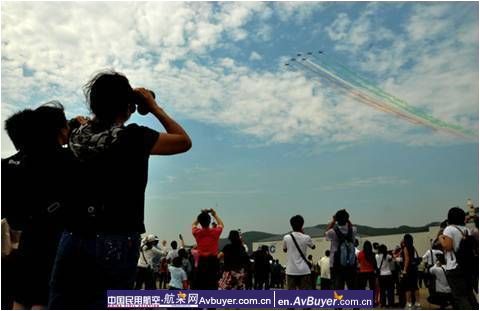 在前几天,印度阳光特技飞行表演队每天只有一场例行表演,今天为了迎合航展的需求,改为上下午各表演一场,只是上午的表演由原来的九机缩为六机,即便如此,观众还是大呼过瘾。
