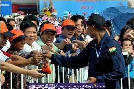 停靠着印度运输机的展位,被观众围得水泄不通,栏杆内的印度空军不时向人群散发各种纪念品,引起观众的哄抢,几乎挤翻栏杆,在保安人员的大声阻止下,才变的有秩序一些,不少人对这种表现表示了气愤,他们认为,这是在印度空军面前丢中国人的脸。除此之外,不少观众不注意保持环境卫生,在场地上席地而坐,随手把吃过果皮、食品包装袋满地乱扔。
