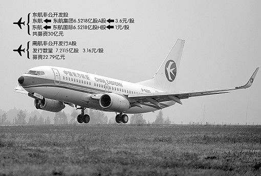 东方航空公告显示,拟以非公开发行的方式,向公司的控股股东中国东方航空集团公司以3.60元人民币/股的价格发行65218万股A股,同时以1元人民币/股的价格发行同等数量股份H股,募集资金总额总计约为30亿元,用以补充公司流动资金。