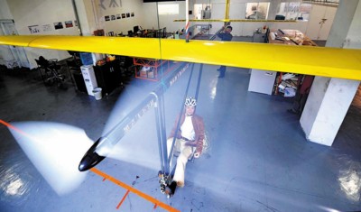 只用两条腿,蹬上一辆机重只有35公斤,长着27米泡沫三合板“翅膀”却没链条的“自行车”,就能脱离地心引力起飞!昨天,这架如巨翅脚踏车一般,号称“国内首架”的人力飞机,在闵行区金都路一个装备精良的私人作坊里亮相。 设计师毛一青兴奋地戴上自行车头盔,登机向记者进行了展示。他通过两条腿为飞机螺旋桨提供动力,令螺旋桨飞快地转动。据悉,这架飞机由11位民间技师参与设计和制造,经过两年的攻关,终于成功诞生。在已经进行的内部试飞中,它成功实现了126米不间断安全飞行的记录。 该原形机将于今年6月在寻找到合适的场地后正式起飞。(记者 陈征) |