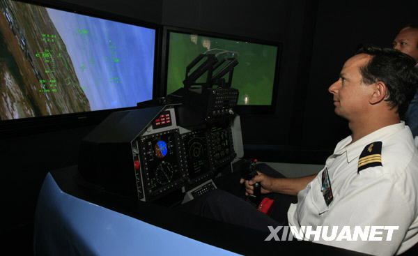 6月16日,在法国首都巴黎,一名法国空军飞行员在巴黎航展中国航空工业集团公司的展台内试用猎鹰L-15高级教练机模拟器。 新华社记者张玉薇 摄