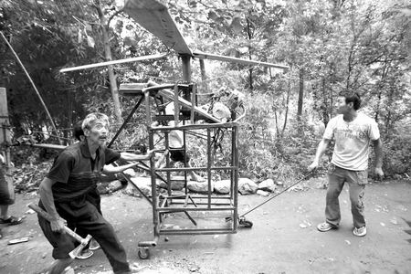 吴中元(右一)拉着自制的“直升飞机”