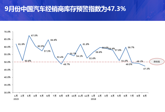中国汽车流通协会发布的“中国汽车经销商库存预警指数调查”VIA(Vehicle Inventory Alert Index)显示,2016年9月库存预警指数为47.3%,比上月微降1.8个百分点。库存预警指数位于警戒线以下。