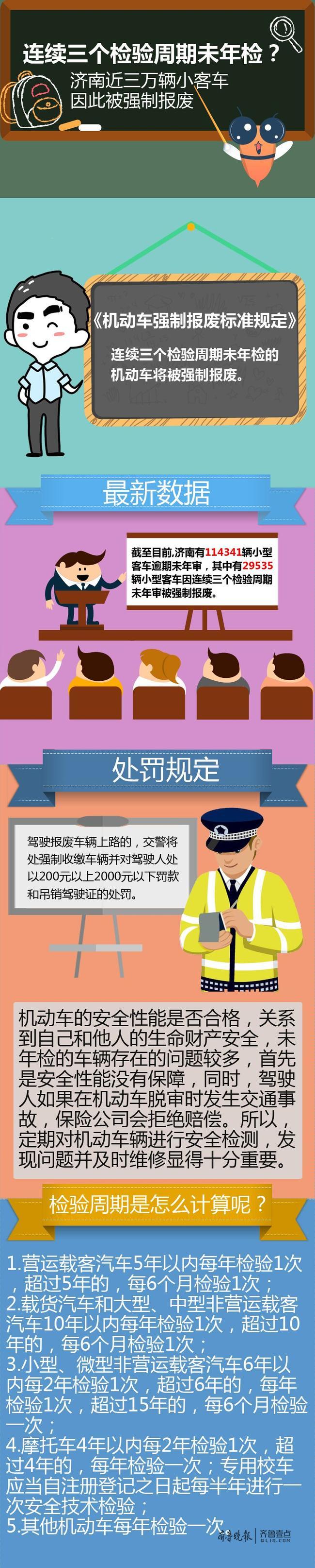 “根据规定,驾驶报废车辆上路的,交警将处强制收缴车辆并对驾驶人处以200元以上2000元以下罚款和吊销驾驶证的处罚。”济南市车辆管理所业务指导科副科长郭军生介绍说,检验有效期满后连续三个机动车检验周期的最后一个检验日期,为机动车的逾期检验强制报废日期。