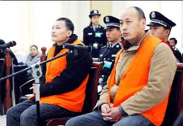 12月15日,被告人时军锋(前右一)、时建锋在法庭上听审。