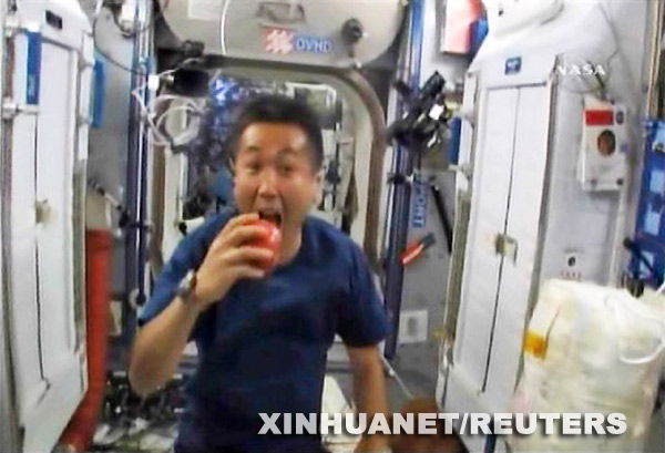 美国国家航空航天局3月20日的视频截图显示,日本宇航员若田光一在国际空间站内吃苹果。