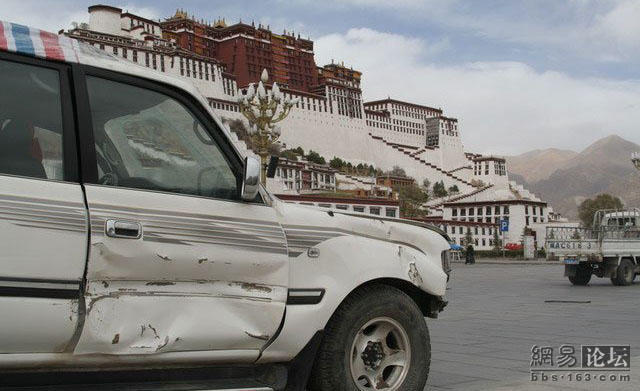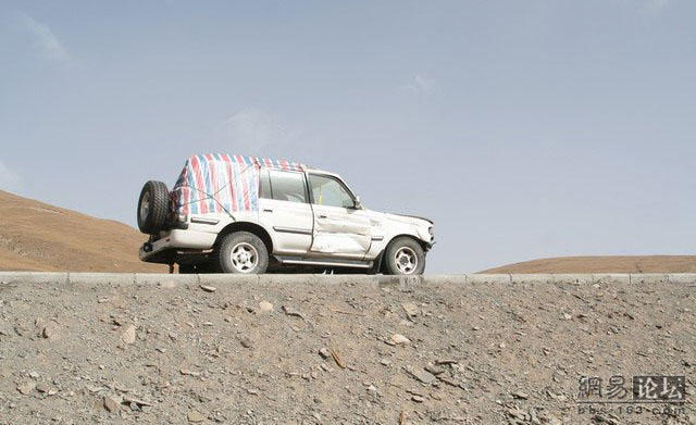 这位老兄刚买了一辆二驱的富奇,没上牌就上西藏,没想到来了个真实的碰撞,由于车内四面透风,所以车主全副武装.由于车破不让上高速走的全部是省道.