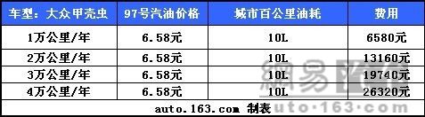 新甲壳虫汽车配有2.0升115匹马力的彭湃动力,4/6速手自一体变速箱,不仅能满足驰骋飞奔的要求,同时在油耗、排放等方面更为环保。5气囊,电动天窗,倒车雷达等配置,有ESP、EBD、ABS、EDL、ASR等安全系统,“伽马 CD”音响,可加热前座椅,可以说是既安全,又好玩的甲壳虫了。 为了好好地伺候亮丽的小虫子,给它用97号油也是理所当然的。以编者的了解,购买甲壳虫的消费者一般都是家里的第二甚至是第三辆汽车,所以甲壳虫平时的主要作用仅仅是短途的驾驶。用它穿州过省的机会较少,用于会客见面也难有用武之地,所以每年1万公里的驾驶里程属于正常水平。而油耗水平百公里10L左右,也能得到编者的接受,尽管编者没有长时间拥有一辆甲壳虫,但编者曾驾驶过一周时间,油耗水平在同级车水平。而且购买它的重要目的是亮丽的外型,何况它10L的油耗,有什么好怨言的呢?难道还要开着它去拉货?