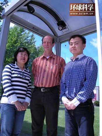 图:从左到右:朱丽叶·朱,Adrian Kitai, 张伟。他们研发的柔性太阳能带被应用在麦克马斯特大学校园的公共汽车候车亭进行照明。