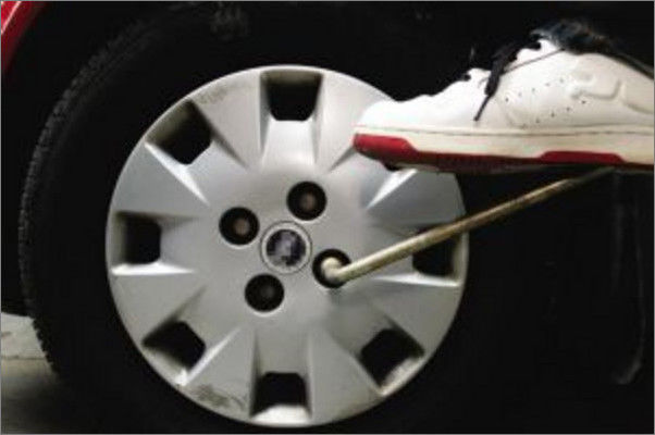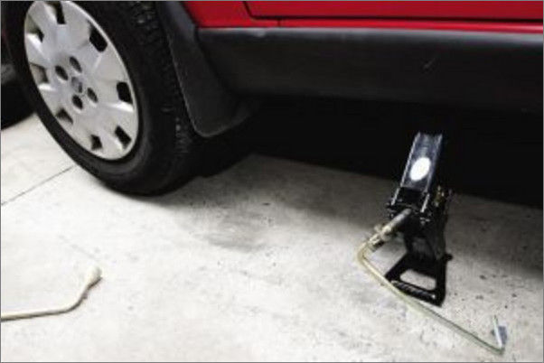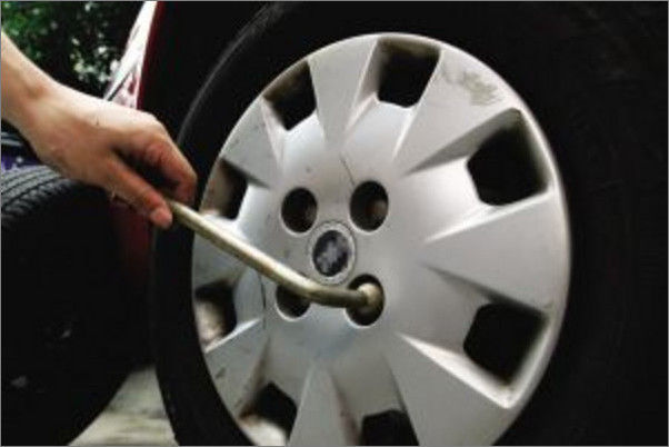 取出备胎(通常在行李厢下面)、轮胎扳手和千斤顶。