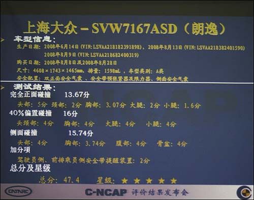 总分47.4 A级车有史以来最好成绩来源于扎实的车身工艺 整体上看,在本次C-NCAP的“正面100%重叠刚性壁障碰撞试验” 和“正面40%重叠可变形壁障碰撞试验”两项正面碰撞测试中,朗逸分别以50.7km/h和56km/h的速度撞向壁障,碰撞瞬间车身姿态基本保持平稳,碰撞后四个车门均能顺利开启,前风挡玻璃没有出现明显的裂痕。车身结构保持较好,A,B,C柱没有变形,从正、副驾驶席安全气囊和假人的接触点来看,安全气囊和假人头部接触点比较准,碰撞结果让人满意。 本次碰撞试验评分结果一览 ![]() 生产企业及型号测试年度试验评分星级 正面100%重叠刚性壁障碰撞试验正面40%重叠可变形壁障碰撞试验可变形移动壁障侧面碰撞试验加分项总分 1河北红星汽车制造有限公司——HX6300A(双环小贵族)2008年第三批0.877.6110.97019.5★★ 2北京现代汽车有限公司——BH7164MW(伊兰特悦动)2008年第三批13.8613.8712.411④41.1★★★★ 3中国第一汽车集团公司——CA7300N4(红旗HQ3)2008年第三批13.615.3163②47.9★★★★★ 4长安福特马自达汽车有限公司——CAF7230A(蒙迪欧-致胜)2008年第三批14.561614.912①47.5★★★★★ 5广州丰田汽车有限公司——GTM7160G(雅力士)2008年第三批12.9915.6215.443②47.1★★★★★ 6上海大众汽车有限公司——SVW7167ASD(朗逸)2008年第三批13.671615.742①47.4★★★★★