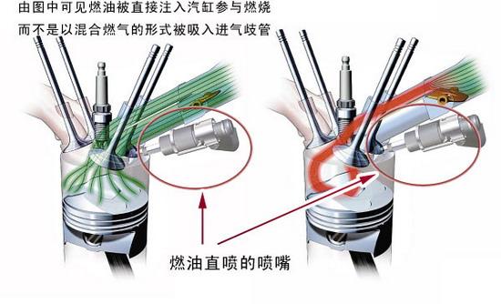 在构造上,传统多点喷射系统的喷油嘴是位于进气歧管前方,在引擎需要供油时,由计算机计算出最佳的供油量并与进入引擎的空气混合后,经由进气阀门到达汽缸内部,并进行压缩、爆炸等动作。至于缸内直喷系统,则是将喷油嘴置于汽缸内部,其特色在于引擎燃油的取得不需要经过气门的开启,而能够藉由计算机主动控制喷油时间、压力与喷射量。与传统喷射系统相较,缸内直喷不受限于传统机械构造的进气方式,而且能够依照引擎所需随时调整空燃比例等特点,均使其表现拥有无限的想象空间。 ![]() 图为燃油直喷系统 众所皆知,内燃机在一般工作状态中所需的理想油气比例为1:14.7,这种调配是传统化油器的专长,不论天候、温度,永远进行着一成不变的工作。然而在少数状态下如冷车启动、怠速运转、急加速或低气压环境等,这样固定的供油方式实际上并无法全面满足引擎的运转需求,甚至可能因而产生黑烟、燃烧不全与马力不足等状况。至于喷射供油系统,则相对显得智能许多,其中枢系统会随时侦测引擎温度、进气流量、转速变化、震动状况,并依照实际需求调整供油量与点火时间,因此在动力输出、燃油经济与排污表现上可以取得相当不错的平衡。 但是由于引擎构造的先天限制,喷射引擎所吸进油气的时间只有在气门开启状态下才能进行,故行车计算机所能控制的因子其实也相当有限。直到缸内直喷系统问世后将喷油嘴内移到汽缸内部后,才开启了全新的视野,其能直接由计算机主动决定喷油时机与份量,至于气门则仅看管“纯空气”的进入时程,两者则是在进入到汽缸内才进行混合的动作。 也由于油、气的混合空间、时间都相当短暂,故缸内直喷系统的喷油嘴必须辅以高增压系统,以大幅提高燃油的喷射压力与效率,并达到高度雾化的效果,期有更佳的混合表现。此外,缸内直喷系统的燃烧室、活塞也大多具有特殊的导流槽,以供油气在进入燃烧室后能够产生气旋涡流,藉以提高混合油气的雾化效果与燃烧效率。 在构造改变之后,供油动作已完全独立于进门与活塞系统之外,中央计算机也因而拥有更多的主导权。于是乎,超乎传统喷射理论的稀薄燃烧与更多元的混合比便得以发生。 在稳定行进或低负载状态下,采用缸内直喷设计的引擎得以进入Ultra lean(精实)模式。在此设定下,引擎于进气行程时只能吸进空气,至于喷油嘴则在压缩行程才供给燃料,以达到节约效果。根据实际测试,其最高能达到1:65的油、气比例,除了节能表现相当惊人,整体动力曲线也能够维持在相当高的平顺程度。然而本模式由于会产生相当大量的NOx(硫化物)与高温气体,所幸在近期由于技术与材料科学的突破,故也已得到相当程度的解决。 ![]() 图为奥迪2.0升TFSI直喷发动机 常见的燃油直喷技术 大众/奥迪 FSI/TSI/TFSI/T FSI ![]() 代表车型:明锐(参数配置 图库)、迈腾(参数配置 图库)、奥迪A4(参数配置 图库) 3.2升的奥迪A6(参数配置 图库)L的百公里油耗仅为11升。这要归功于FSI发动机的缸内直喷技术。FSI发动机与传统发动机相比,最大的亮点在于发动机的经济性提高了15%。奥迪FSI增加了火花塞点燃式发动机的扭矩和输出,与常规的点燃式发动机相比,FSI可将燃油直接喷入燃烧室,从而增大了输出功率并降低了燃油消耗。但是奥迪的FSI由于中国的汽油使用硫提纯,所以在燃烧的过程中会产生大量的剧毒硫化物而取消了缸内置喷技术中关键的分层燃烧技术,而改作均质燃烧技术,造成一定的技术缩水。但不可否认,FSI仍然是同类发动机中的佼佼者之一,代表了大众在中国的技术地位。 ![]() ![]() 图为奔驰的CGI直喷技术发动机 奔驰CGI ![]() 奔驰CGI 继FSI和SIDI之后的第三款燃油直喷发动机,不过搭载CGI发动机的奔驰车型尚未引入中国但是我们仍然可以对这一技术来憧憬一下,奔驰这款CGI发动机在实现分层燃烧和均质燃烧功能的前提下,多增加了一个智能热量管理系统。在整个加热的过程之中,冷却循环系统停止运作,这样子引擎就能够更快的达到正常运作的温度,从而达到减少引擎内部摩擦和废气排放的功效。为了进一步省油,奔驰对这款发动机进行了轻量化加工,汽缸头、曲柄轴箱全部使用铝制,活塞、联结杆以及汽缸套也都采用了最新的制作方式。 ![]() 图为宝马HPI燃油直喷发动机 宝马HPI(High Precision Injection)