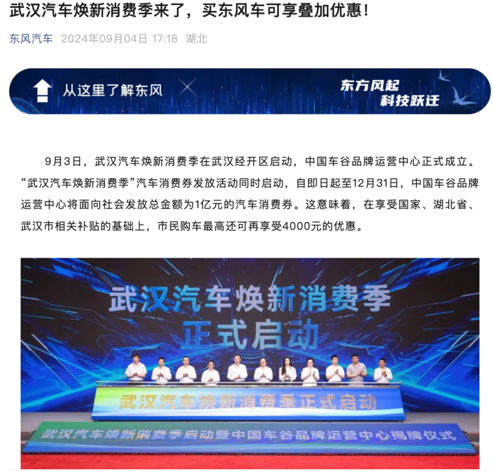 9月3日,“武汉汽车焕新消费季”在武汉市经开区启动,同时,中国车谷品牌运营中心成立,并宣布自即日起至今年12月31日,面向社会发放带一定条件、总金额为1亿元的汽车消费券。