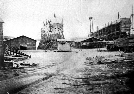 “万年清”即将下水时的照片,可以看到原本垫在船体下方的船台枕木已经被一根根木撑代替。此时的“万年清”船体已经完成,但是桅杆、烟囱等上层建筑还需在下水后装配。