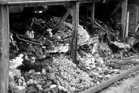车体旁边堆放有几十个黄色蛇皮袋,工作人员说是从车上清理下来的烧焦物品的碎块,遇难者尸体已被清理走,现正通过DNA检测辨别身份,便于家属认领。