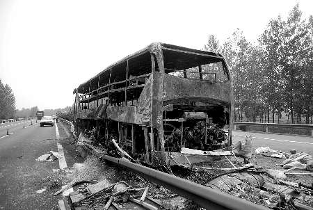在事故现场,弥漫着一股尸体烧焦混合车辆及物品烧毁的恶臭味,客车只剩下一个黑黢黢的骨架。