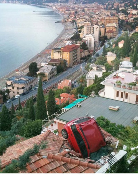 意大利,因为停车忘记拉手刹,一辆菲亚特落到了人家的屋顶上。