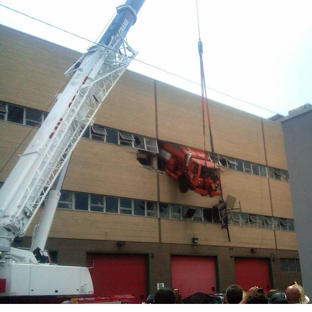 美国纽约皇后区一修理店内,一辆卡车穿过二楼墙壁。